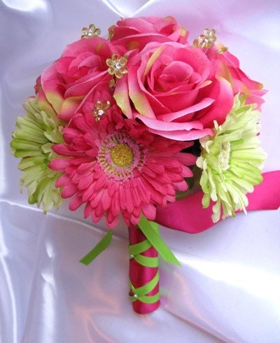 Bouquet Fuchsia Green Daisy Wedding Flowers Bridesmaids Boutonnieres.